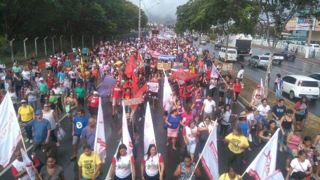 Classe trabalhadora mostra, mais uma vez, sua posição firme e forte contra as propostas reformistas e os demais projetos nefastos do governo Temer. Após concentração, na pracinha de Goiabeiras, próximo à Universidade Federal do Espírito Santo (Ufes), as trabalhadoras e os trabalhadores seguiram em direção ao Aeroporto de Vitória.