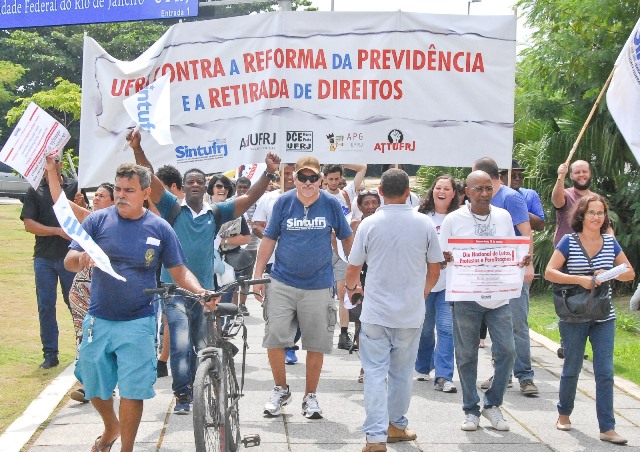 A mobilização na Cidade Universitária começou às 7h, com o café da manhã no hall do Hospital Universitário (HU) , os manifestantes se dividiram e percorreram os andares do HU convocando os servidores para o ato às 9h, na entrada principal da unidade. Às 10h, os manifestantes saíram em passeata até o terminal do BRT, onde prosseguiram com o ato contra o fim da Previdência e da Assistência Social pretendida por Temer.