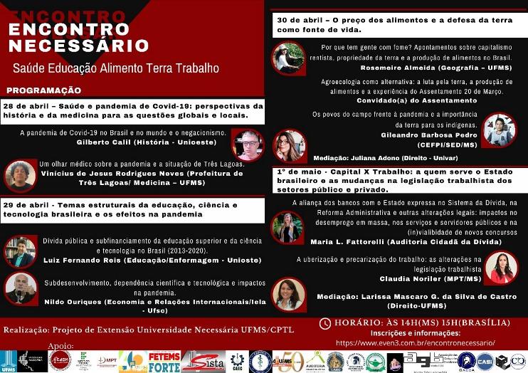 Acontece entre os dias 28 de abril e 1 maio, o evento “Encontro Necessário: Saúde, Educação, Alimento, Terra e Trabalho”, apoiado por diversas entidades, entre elas o SISTA/MS, no âmbito do projeto "Universidade Necessária" (UFMS/Três Lagoas). As transmissões serão ao vivo pelo Facebook (Universidade Necessária UFMS) e Youtube (UFMS – Campus Três Lagoas).