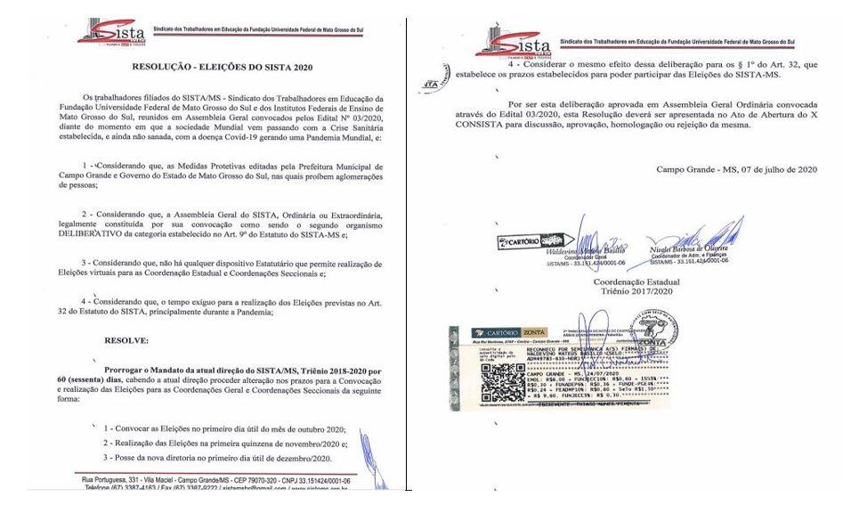 RESOLUÇÃO - ELEIÇÕES DO SISTA 2020 Os trabalhadores filiados do SISTA/MS - Sindicato dos Trabalhadores em Educação da Fundação Universidade Federal de Mato Grosso do Sul e dos Institutos Federais de Ensino de Mato Grosso do Sul, reunidos em Assembleia Geral convocados pelos Edital Nº 03/2020, diante do momento em que a sociedade Mundial vem passando com a Crise Sanitária estabelecida, e ainda não sanada, com a doença Covid-19 gerando uma Pandemia Mundial, e: