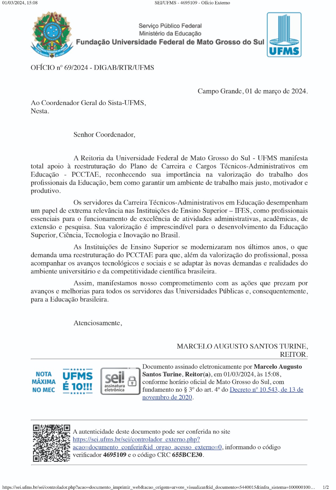 Cumprindo mais uma etapa do que foi deliberado na Reunião de Direção da FASUBRA com as Entidades de Base, realizada dia 24 de fevereiro de 2024, após ter enviado o oficio Nº 011/2024-SISTA-MS, chegou ao SISTA-MS, na data de hoje (1º/03/2024) manifestação de apoio aos servidores(as) e reestruturação da carreira através do Oficio nº 69/2024-DIGAB/RTR/UFMS.