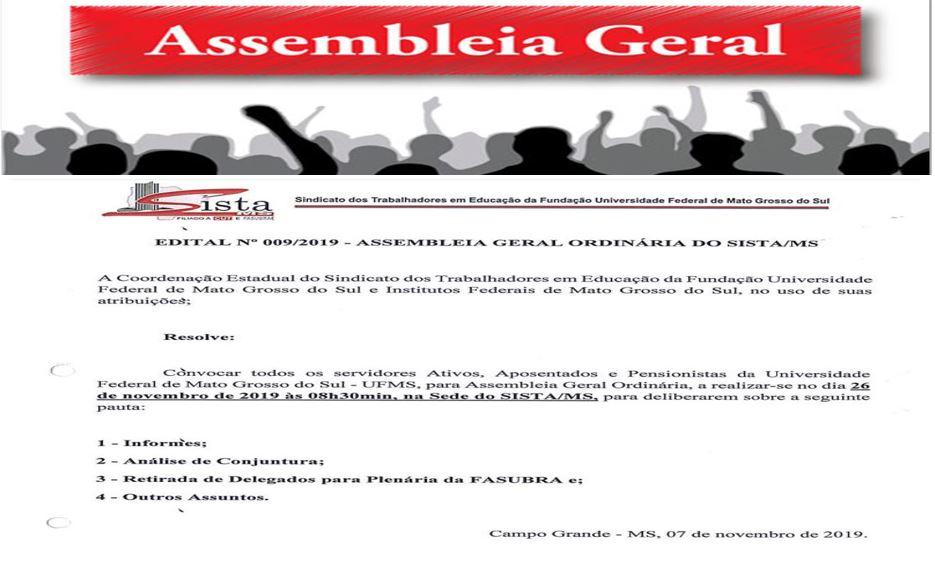 O SISTA-MS convoca servidores Ativos, Aposentados e Pensionistas da Universidade Federal de Mato Grosso do Sul – UFMS para Assembleia Geral Ordinária a realizar-se na terça-feira, dia 26 de novembro, às 8h30 em sua sede, para deliberar sobre os seguintes assuntos: