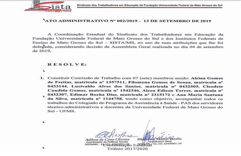 A Coordenação Estadual do Sindicato dos Trabalhadores em Educação da Fundação Universidade Federal de Mato Grosso do Sul e dos Institutos Federais de Ensino de Mato Grosso do Sul – SISTA/MS, no uso de suas atribuições que lhe foi delegada, considerando decisão de Assembleia Geral no dia 4 de setembro de 2019, resolve: