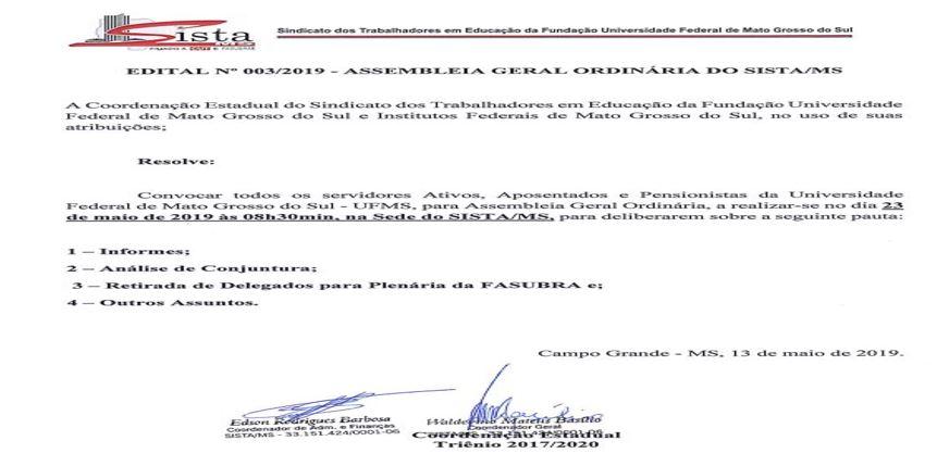 - Convocar todos os servidores ativos, aposentados, e Pensionistas da Universidade Federal de Mato Grosso do Sul – UFMS, para Assembleia Geral Ordinária, a realizar-se no dia 23 de maio de 2019, às 8h30, na sede do SISTA/MS, para deliberarem sobre a seguinte pauta: