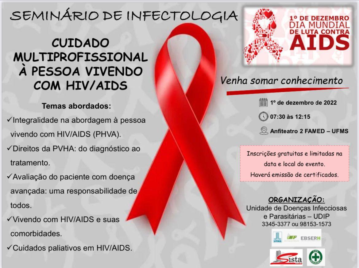 SISTA-MS (Sindicato dos Trabalhadores em Educação da Fundação Universidade Federal e Institutos Federais de Ensino de Mato Grosso do Sul), UFMS (Universidade Federal de Mato Grosso do Sul), EBSERH (Empresa Brasileira de Serviços Hospitalares) e a CIPA (Comissão Interna de Prevenção de Acidentes no Trabalho) em apoio a organização da UDIP (Unidade de Doenças Infecciosas e Parasitárias) realizam no dia 1º de dezembro de 2022,  Dia Mundial de Luta contra a AIDS, das 07h30 às 12h30, no Anfiteatro 2 FAMED – UFMS , o Seminário de Infectologia com o tema ‘Cuidado multiprofissional à pessoa vivendo com HIV/AIDS’.