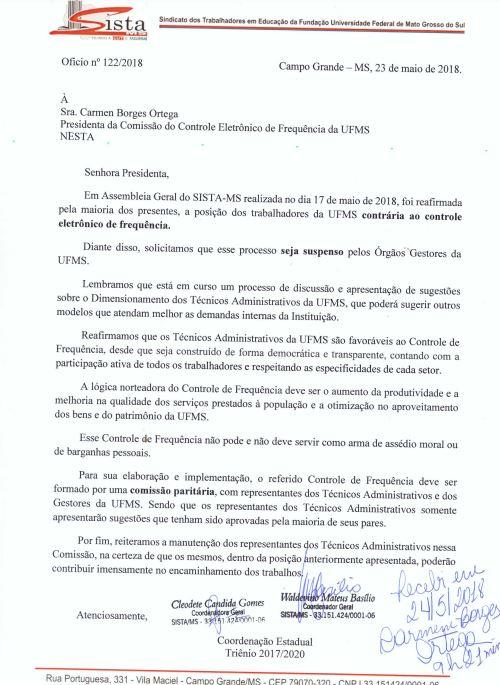 Documento do SISTA-MS, protocolado no dia 24 de maio de 2018 junto à presidenta da Comissão de Controle Eletrônico de Frequência da UFMS, marcando posição contrária dos trabalhadores a esse sistema.