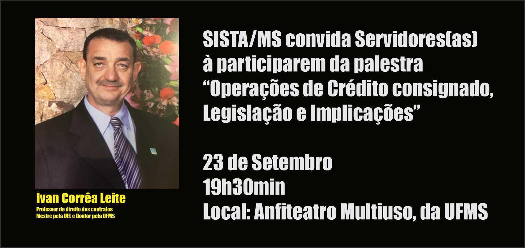 O SISTA/MS convida Servidores(as) a participarem da palestra “Operações de Crédito Consignado, Legislação e Implicações” que será realizada dia 23 de setembro, às 19h30, no Anfiteatro Multiuso, localizado em frente ao Restaurante Universitário do Campus da UFMS