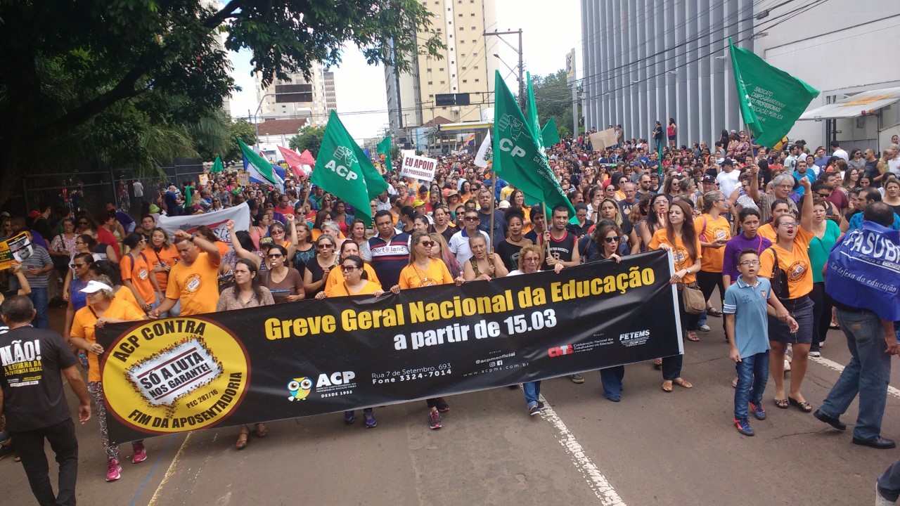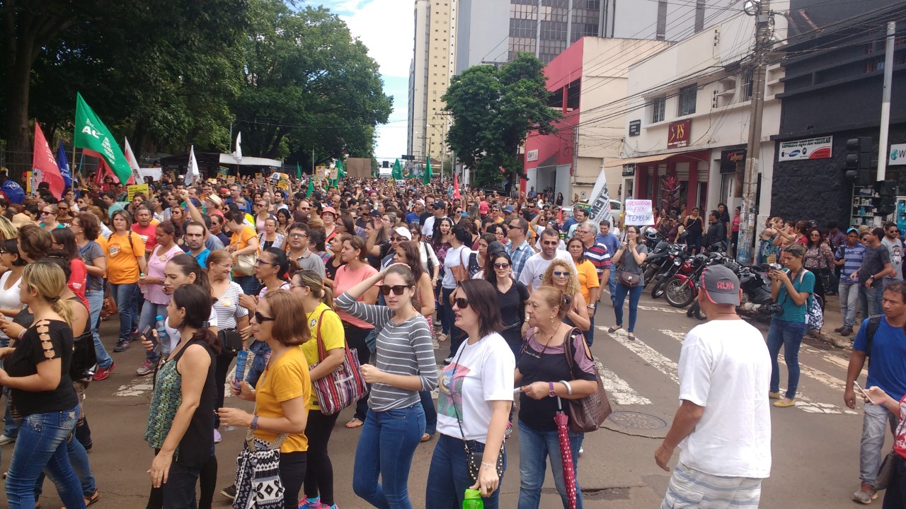 Um público de mais de 10 mil pessoas pararam o centro de Campo Grande na manhã desta quarta-feira, 15 de março, em ato contra a Reforma da Previdência e Trabalhista. Os trabalhadores da UFMS se fizeram presentes à manifestação.