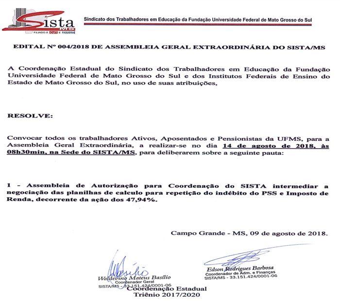 O SISTA/MS convoca todos os trabalhadores ativos, aposentados e pensionistas da UFMS para uma Assembleia Geral Extraordinária nesta terça-feira (14) às 8h30, na sede do sindicato, para deliberarem a seguinte pauta:
